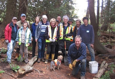 At the workshop, Dave Clough, Fisheries Biologist, Richard Wahlgren, owner of Streamside Native Plants and Peter Law, MVIHES Board member gave interesting presentations on the “what”, the “how” and the “why” of stream habitat restoration and the role of the riparian zone in maintaining stream health. Those who could also attend the planting blitz went out with the professionals to get some hands-on experience by planting some 200 native shrubs at two locations in the Shelly Creek Park – a linear park trail which runs between Hamilton Avenue and the E & N Railway tracks. Many of Saturday’s volunteers were residents who live and enjoy walking in the area. The plants were purchased with funding with a grant from the Parksville-Qualicum Community Foundation.