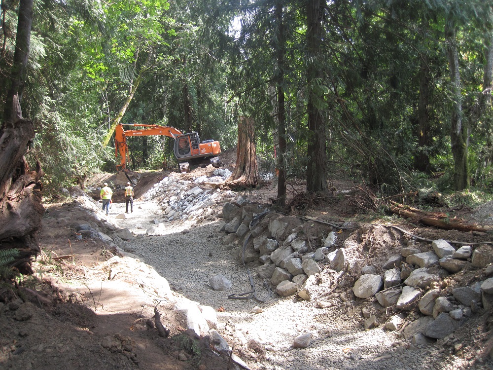 This included armouring the creek banks downstream of the culvert with rock to prevent further erosion. Weirs were constructed using rock and geotextile cloth to create pools. The installation of gravel has created spawning habitat. A large settling pond was constructed upstream of the culvert to trap sediment and prevent it from covering the spawning gravel. And the creek bed was built up to the bottom of the culvert to allow fish passage. In March 2016, swordferns, cedar, salmonberry and red osier dogwood seedlings were planted along the creek banks and in areas that were disturbed by the equipment used to complete the restoration work.