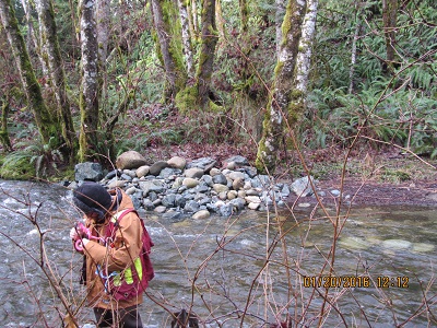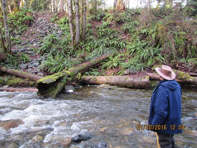 At the request of the Pacific Salmon Foundation, we re-visited all of the restoration sites to assess the success of the restoration efforts. On January 20, 2016 Dave Clough, the biologists who developed the restoration project, along with several MVIHES volunteers, conducted an assessment of the past decade of work. We were very pleased to learn that the rock and LWD structures are still in good condition. PLUS, the objectives of preventing steam bank erosion, and creating riffles and deep pools for fish habitat have been achieved. A very good outcome indeed!